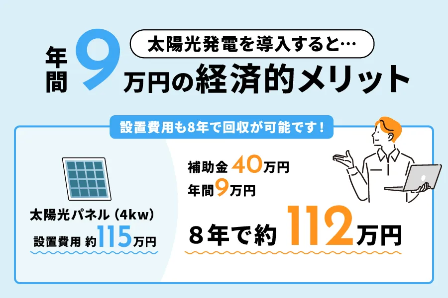 例えば、令和5年8月時点の試算では、約115万円の設置費用の場合、現在の補助金(10万円/kW)を活用すると約8年で回収した事例もございます。4kWの太陽光パネルを設置した場合、初期費用115万円が13年(現行の補助金を活用した場合8年)程度で回収可能です。